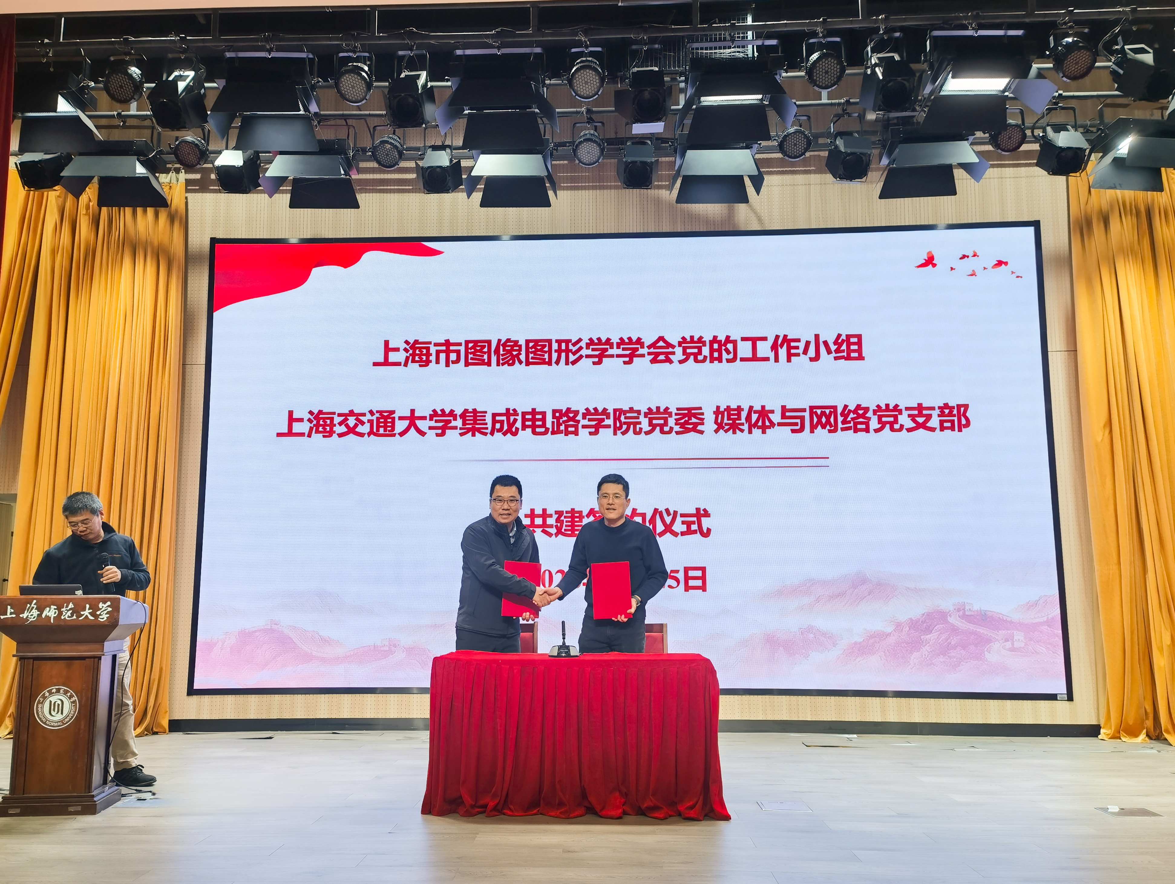 为进一步强化党建引领,推动学会党建与业务工作深度融合发展,会议期间举行了党建共建签约仪式。上海市图像图形学学会党的工作小组与上海交通大学集成电路学院党委媒体与网络党支部达成共建合作,理事长翟广涛与集成电路学院李成林教授代表双方签署共建协议,为学会高质量发展筑牢政治根基。